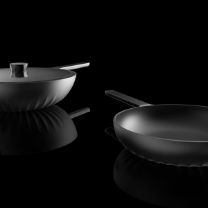 鍋具的設(shè)計是解決問題的一個關(guān)鍵點。受熱不均勻,熱效率低等都造成浪費資源和油煙重的問題。這套鍋具定位高端,本身材質(zhì)采用鋁合金,是具有高導(dǎo)熱系數(shù)的材料。鍋底的紋理在增加了鍋底與火焰的接觸面積的同時更是起到了平均分配熱量的作用提高了導(dǎo)熱效率也使得鍋底受熱更加均勻,有效的控制了油煙。鍋蓋把手上的孔洞有透氣的功能,且能夠根據(jù)不同的食材和烹飪的不同要求調(diào)整大小。凸顯雕塑感的紋理符合高端生活的氣質(zhì)。鍋底的紋理,把手的紋理,鍋蓋把手的紋理,雖然功能不一樣卻同樣在設(shè)計上具有一致性。處于家族感的考慮,煎鍋與炒鍋在局部都用了統(tǒng)一的形式語言。