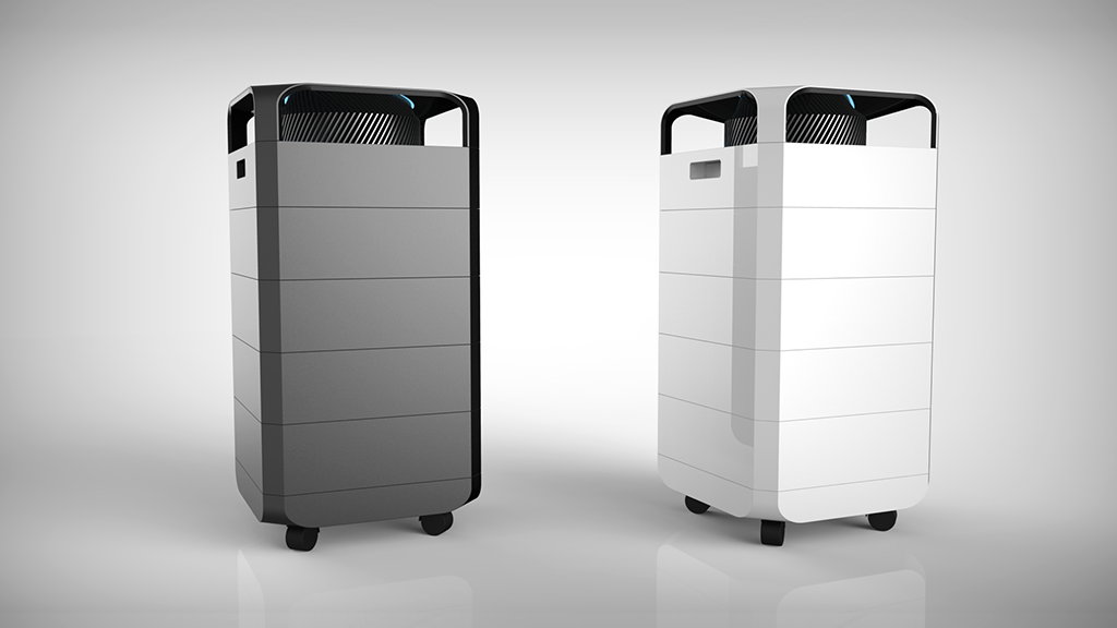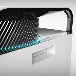 該產(chǎn)品底部進風,風機置頂,空氣流經(jīng)層層濾網(wǎng),由頂部的風機將潔凈的空氣向四個方向噴出,合理的結(jié)構(gòu)保證了盡可能大的濾網(wǎng)有效橫截面積,減少空氣流經(jīng)路徑的轉(zhuǎn)向?qū)艋芰淼挠绊憽A硗饪諝鈨艋魈峁┝怂膶游恢冒惭b濾網(wǎng),可靈活自定義,根據(jù)自身需求靈活選擇濾網(wǎng)組合。同時還創(chuàng)新性地提供了多款專效濾網(wǎng),針對甲醛、細菌、煙味等,專注于解決不同使用環(huán)境中用戶的痛點,滿足每一個用戶對潔凈空氣的需求。設(shè)計概念重點表現(xiàn)未來感及科技感,電機防護罩周圍的隱藏式燈帶可直觀的反映出室內(nèi)的空氣質(zhì)量情況,是整個設(shè)計的點睛之筆。設(shè)計語言在保持硬朗高效率寓意的前提下也進行了去邊角處理,增加產(chǎn)品的友好性。色彩材質(zhì)方面以代表潔凈的白色為主色調(diào),電機罩部分以銀色寓意功能強大,中間以黑色進行過度和增加對比。體現(xiàn)出外表極致簡潔,功能極其強大的核心理念。