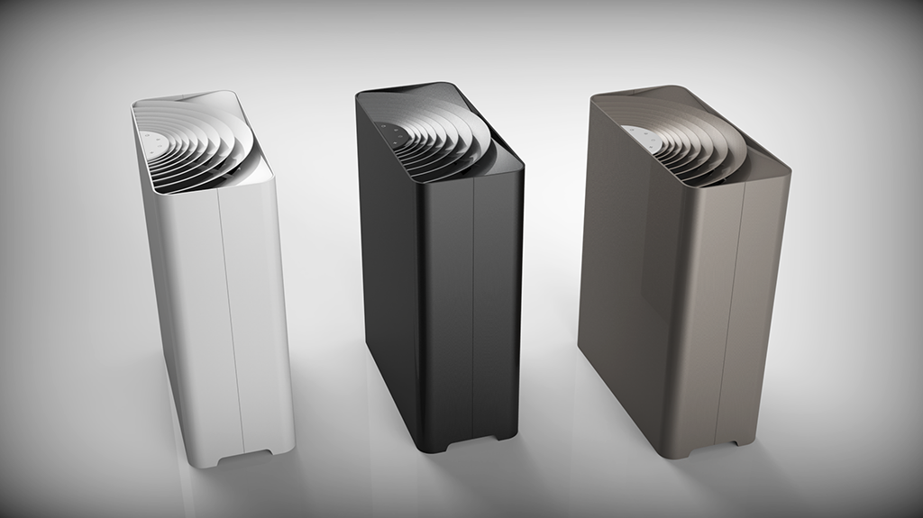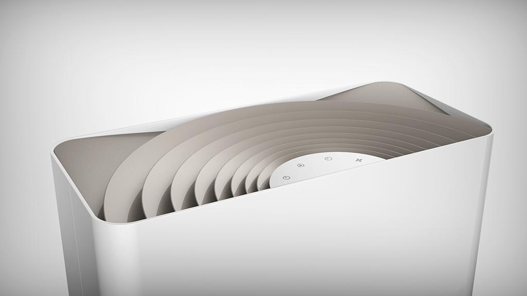 整體的設(shè)計概念大多取自自然的元素,增加了工業(yè)產(chǎn)品的人情味。材質(zhì)的選用和搭配簡潔明了,不突兀,更容易融入各種使用環(huán)境。出風(fēng)口的設(shè)計抽象于安靜水面上泛起的一絲漣漪,擴(kuò)散的語言也符合出風(fēng)的寓意。機(jī)器背面的進(jìn)風(fēng)口的設(shè)計在符合整體有機(jī)、自然的風(fēng)格下也加強(qiáng)了進(jìn)風(fēng)的產(chǎn)品語義。整體設(shè)計在平面的外表下又具備一些充滿靈氣的細(xì)節(jié)。